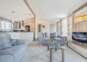 Modern and contemporary caravan with an open plan lounge, kitchen and dining area, outdoor verandah with hot tub, perfect for holidays and special occasions. Sleeps six, dog-friendly.