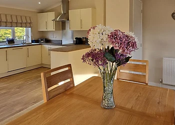 Luxury modern lodge to sleep four with one master double complete with en suite shower and a second twin bedroom. One family bathroom with bath and overhead shower. The contemporary lodge features as spacious kitchen, dining area with a separate bright and airy lounge complete with patio doors leading to decking area with outdoor bubbling hot tub. Pet friendly lodge with one dog welcome per lodge.