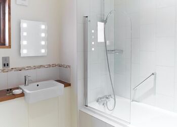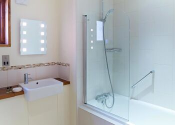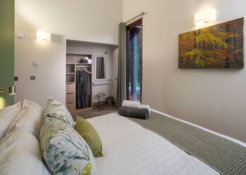 The highest quality luxury lodge with master double with en suite shower, one double and two twin. Bathroom with overhead shower. Shower room. Log burning stove. Bathrobes in master bedroom. Decking with outdoor hot tub and access by an adventure bridge to a double bedroomed newly redesigned treehouse with its own en suite shower. A perfect hideaway for adults and children alike.Images are representative and may not be the specific accommodation assigned on booking.