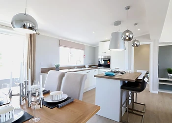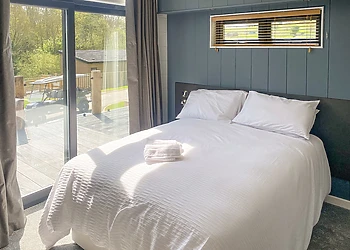 A stylish and contemporary, two-bedroom holiday home perfect for couples or families. Tastefully furnished main bedroom with king-size bed and en suite shower room, with a second bedroom that features two full size single beds. The lodge also includes well sized family showroom. Bright, spacious open-plan living space featuring comfortable soft furnishings and a Smart TV. Well-equipped kitchen/dining area with a great range of appliances. Private outdoor decking area with high quality dining and lounge furniture to make the most of the peaceful and picturesque surroundings, all sat alongside a sunken hot tub to sit back and relax in. Parking outside lodge. Please Note: This accommodation is not suitable for individuals with limited mobility, No pets.