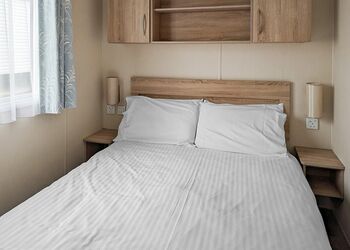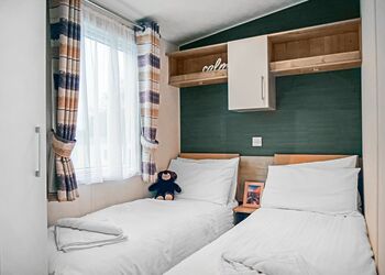 Modern 12ft-wide caravan with one double and a twin bedroom. open-plan living area with 32” TV and fridge/freezer. Double glazed and centrally heated.Images are representative and may not be the specific accommodation assigned on booking.