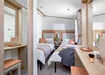‘Sumptuous open-plan living’ is how these holiday homes were described to us, and we absolutely agree. With our 2023 models, you get the holiday vibe as soon as you walk in through the door. A lounge area with ‘L-shaped’ sofa and Smart TV welcomes you as does the adjacent separate dining area with freestanding table and chairs. The galley style kitchen with both integrated dishwasher and microwave oven, allows for a generous twin-bedded room and the main shower room. The master suite with King-sized bed occupies the rear of the holiday home and benefits from the convenience of its own en suite shower room and walk-in wardrobe.Images are representative and may not be the specific accommodation assigned on booking.