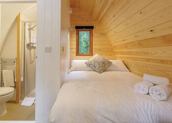 Luxury woodland studio pod set within woodland and minutes from the lakeside with one double bed. Kitchen area with hob, microwave and fridge. Shower. Decking with garden furniture and outdoor hot tub, perfect for outdoor dining and entertaining. Adjacent parking.Images are representative and may not be the specific accommodation assigned on booking.