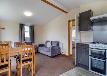 Spacious, comfortable lodge with one double and one twin. Additional sleeping for two in the lounge area. Open plan lounge/diner with kitchen area. Double glazed and heated throughout. Decking with picnic bench. No pets.Images are representative and may not be the specific accommodation assigned on booking.