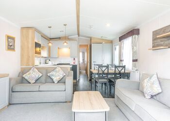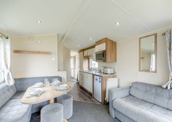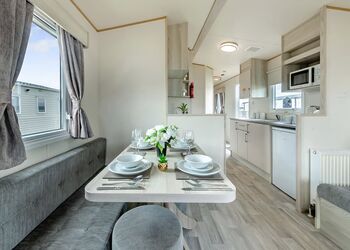 Our best in range caravan. Features a spacious interior with a premium finish for a memorable stay. Features a fully equipped kitchen, heating & double glazing, a bathroom with shower, and beds fully made up on arrival. Plus, a complimentary hub pass! Images are representative and may not be the specific accommodation assigned on booking.