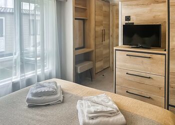 Outstanding, spacious lodge with two king-size bedrooms. Shower. Open plan lounge/diner with kitchen area. Verandah with garden furniture and outdoor hot tub.Images are representative and may not be the specific accommodation assigned on booking.