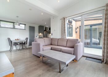 Luxurious and contemporary lodge with one double with en suite shower room and one twin. Spacious bathroom with bath with overhead shower. Modern well equipped open-plan living, dining area and kitchen. Patio doors leading to spacious decking area.Images are representative and may not be the specific accommodation assigned on booking.