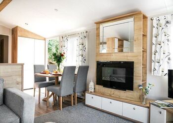 Finished to a high standard, the Avonmore is spacious, warm, and comfortable. Finished in a contemporary style, complete with central heating, double glazing, flat-screen TV and modern feature fireplace. The open plan layout includes a separate dining area and a fully equipped modern kitchen. This 2-bedroom holiday home has one en suite master bedroom and one twin bedroom. These caravans are offered with settee conversion in the living room area, so a party of six can comfortably sleep in style.Images are representative and may not be the specific accommodation assigned on booking.