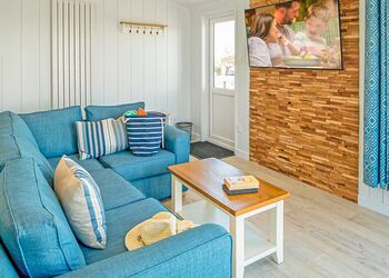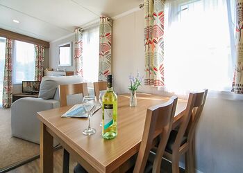 Contemporary caravan with one double with en suite shower and one twin both with flatscreen TV. Shower. Heated throughout. Living area with doors leading to decking area with garden furniture and outdoor hot tub. Early 3.00pm check in. No pets.