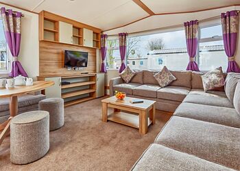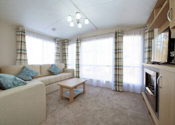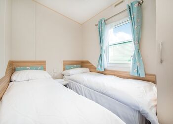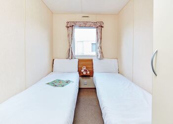 12ft-wide caravan with one double and two twin. Additional sleeping for two in the lounge area. DVD and soundbar. Fridge/freezer. Double glazed and centrally heated. No pets.Images are representative and may not be the specific accommodation assigned on booking.