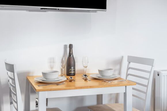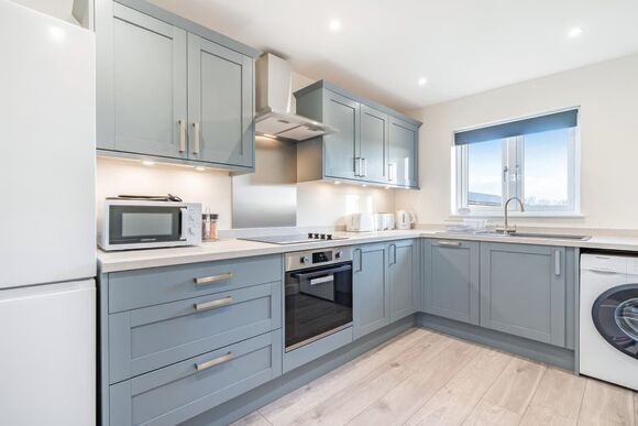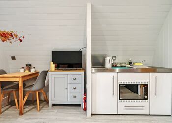 - Toaster, kettle, microwave, fridge, two-ring induction hob