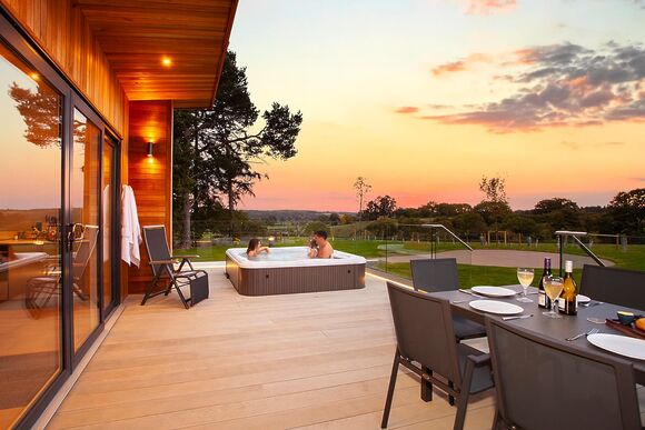 - Glass balustrade balcony with large Jacuzzi hot tub and patio with garden furniture